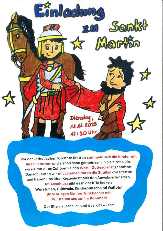 Vor der katholischen Kirche in Stetten sammeln sich die Kinder mit ihren Laternen und ziehen dann gemeinsam in die Kirche ein, wo sie mit allen Zuhörern einen Wort - Gottesdienst gestalten. Danach laufen wir mit Laternen durch die Straßen von Stetten und freuen uns über Kerzenlicht aus den Anwohnerfenstern.