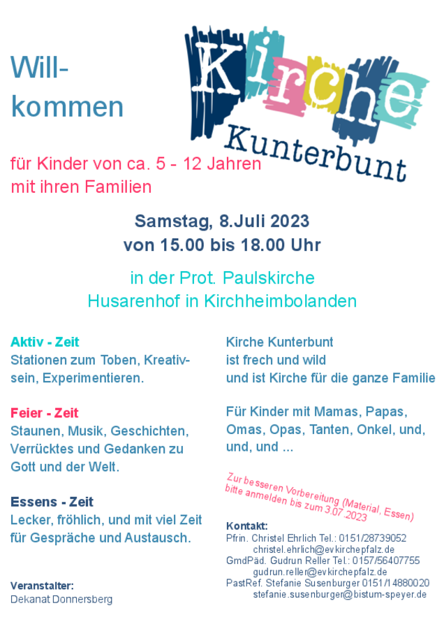 Am Samstag, dem 08. Juli 2023 von 15:00 bis 18:00 Uhr findet in der Prot. Paulskirche, Husarenhof Kirchheimbolanden die Kirche Kunterbunt für Kinder von ca. 5 - 12 Jahren mit ihren Familien statt.